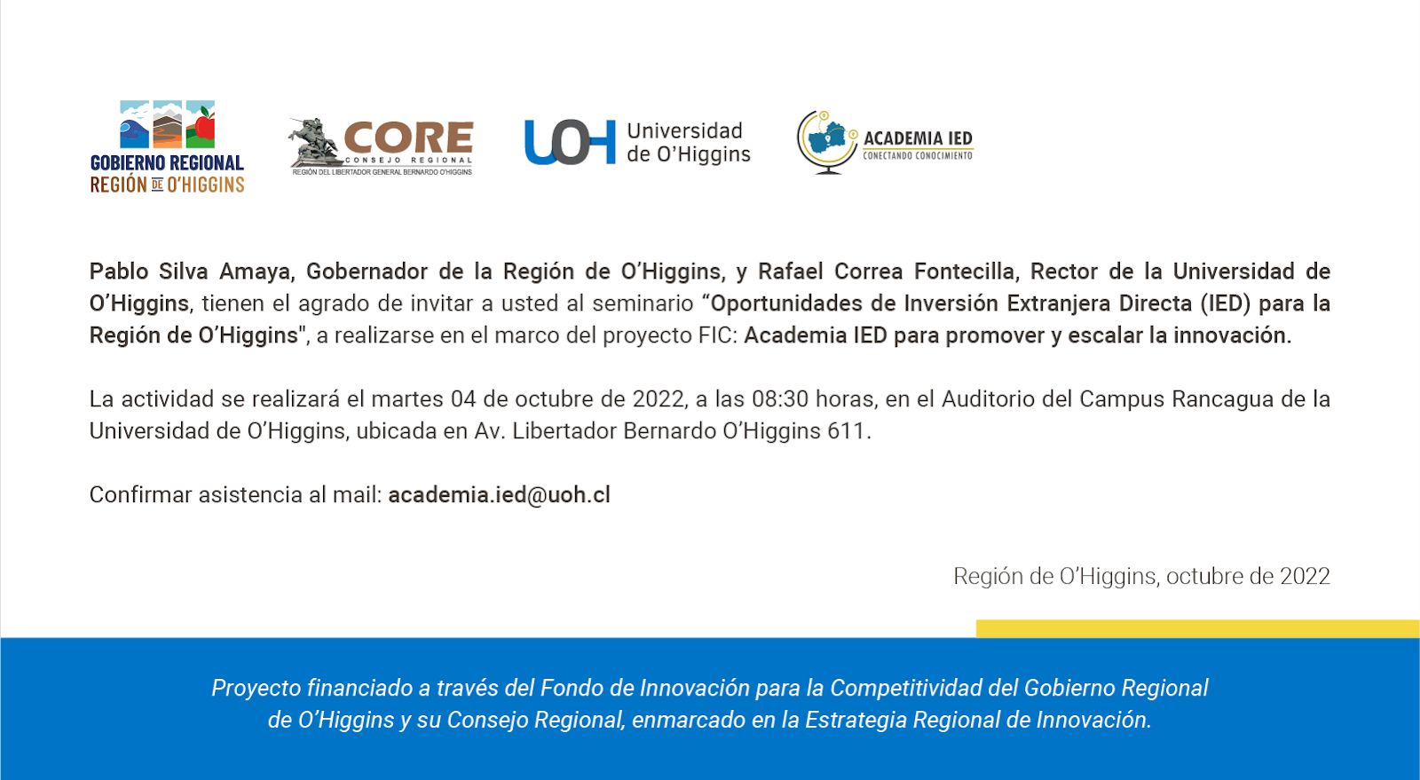 Este martes 04 de octubre, se desarrollará el seminario internacional: “Oportunidades de Inversión Extranjera Directa (IED) para la Región de O´Higgins”, organizado por la Academia IED de la Universidad de O´Higgins.